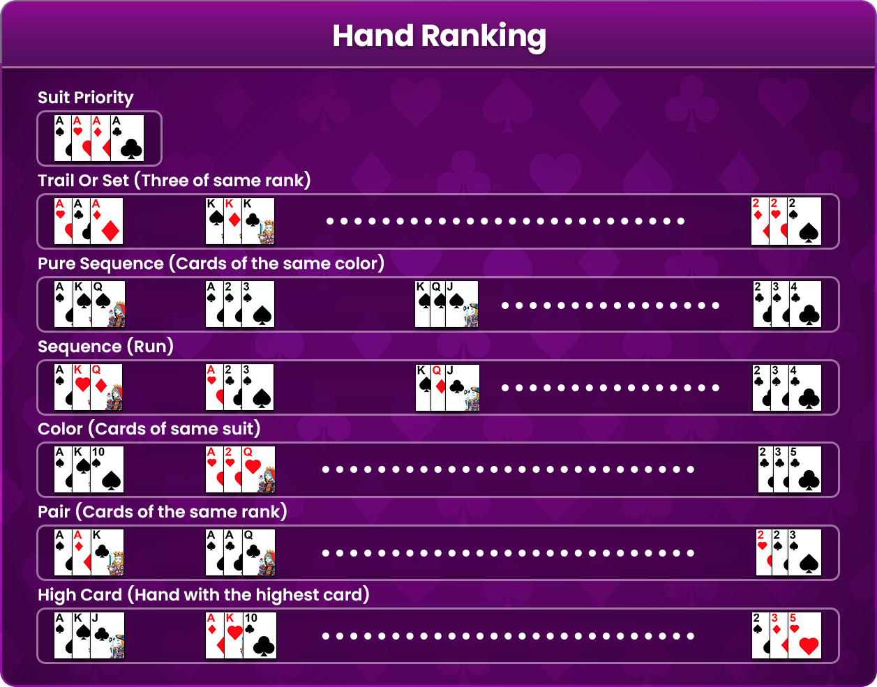 The figure below shows highest to lowest cards of each rank. It should be noted that in a sequence A-K-Q is the highest ranked sequence while A-2-3 is the second highest ranked sequence.